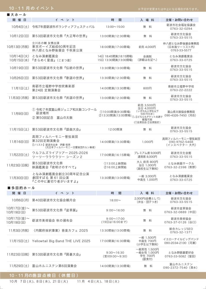 砺波市文化会館主催以外のイベントについては、それぞれの主催者へお問い合わせください。